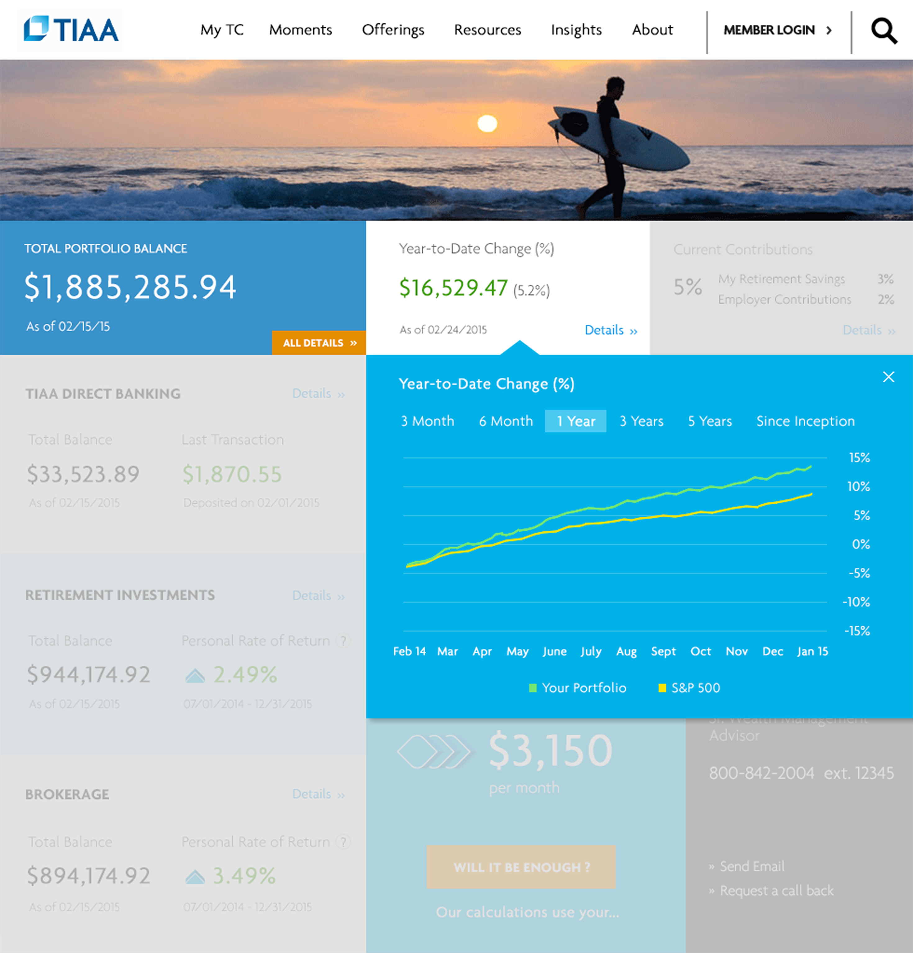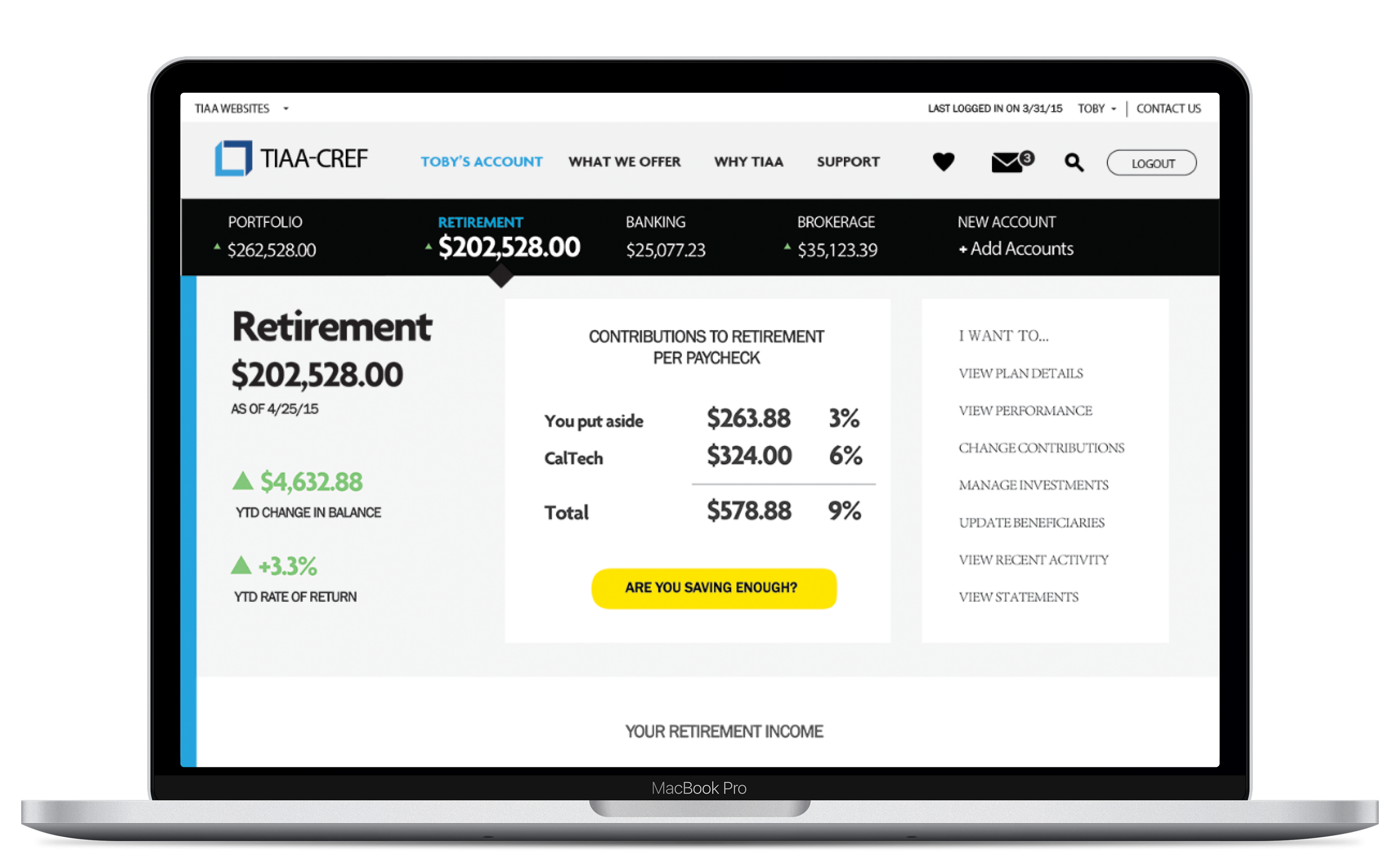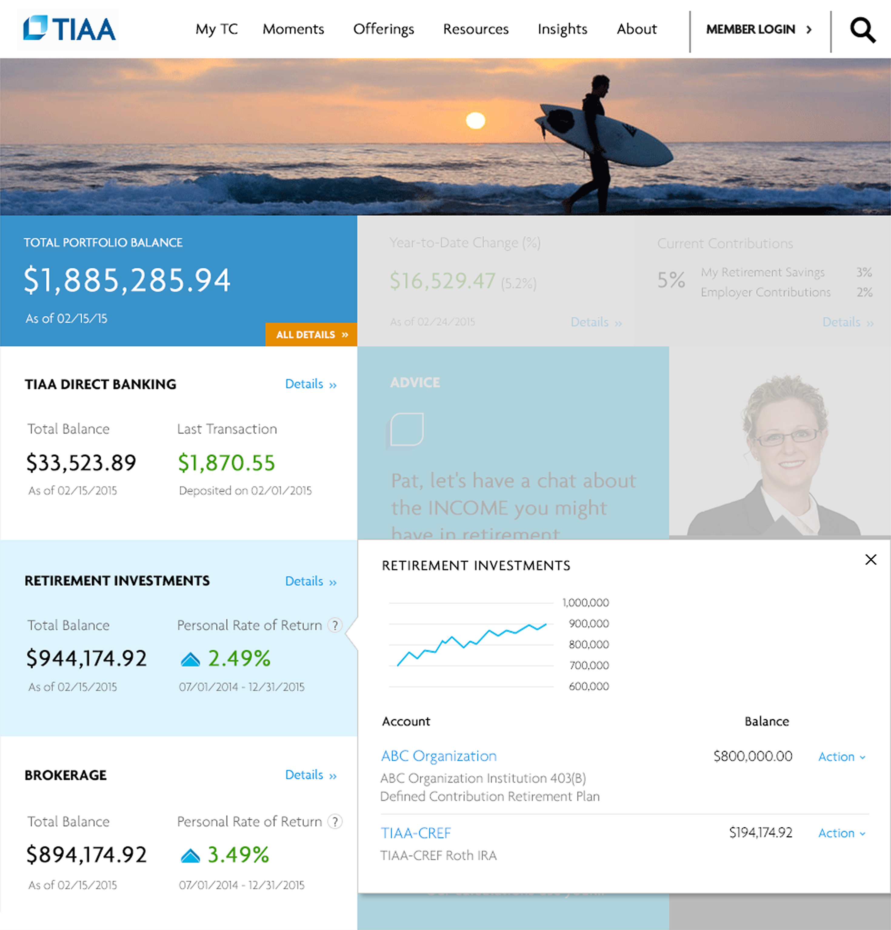 Clicking on “Retirement Investments” displays retirement performance and accounts balances.