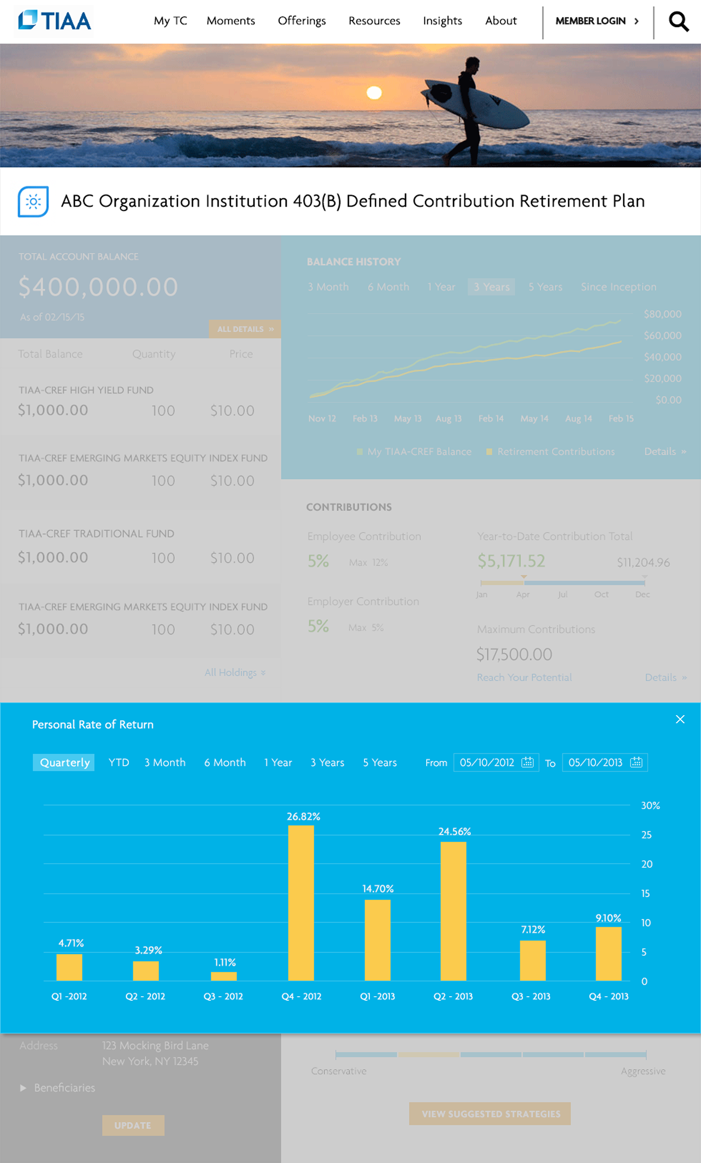 Clicking on Current Contributions displays the most recent retirement contribution and encourages customers to contribute more to take full advantage of their employer’s 4% match.