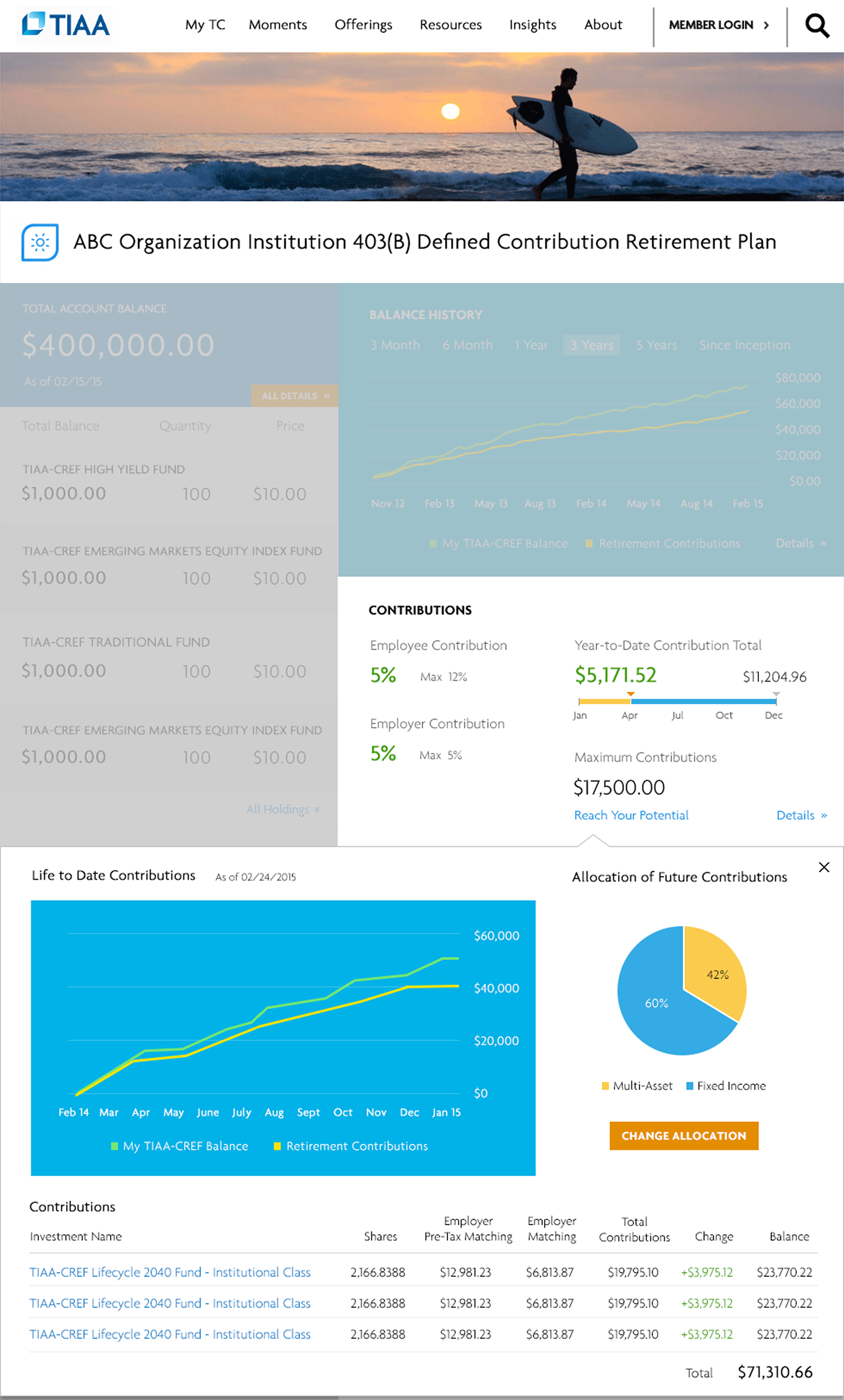 Clicking on Contributions displays the Year-to-Date Contributions chart, along with the asset allocation for future contributions.